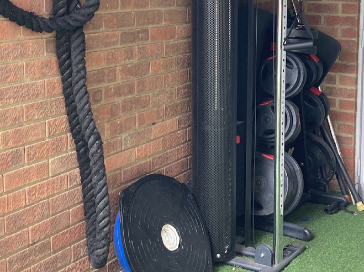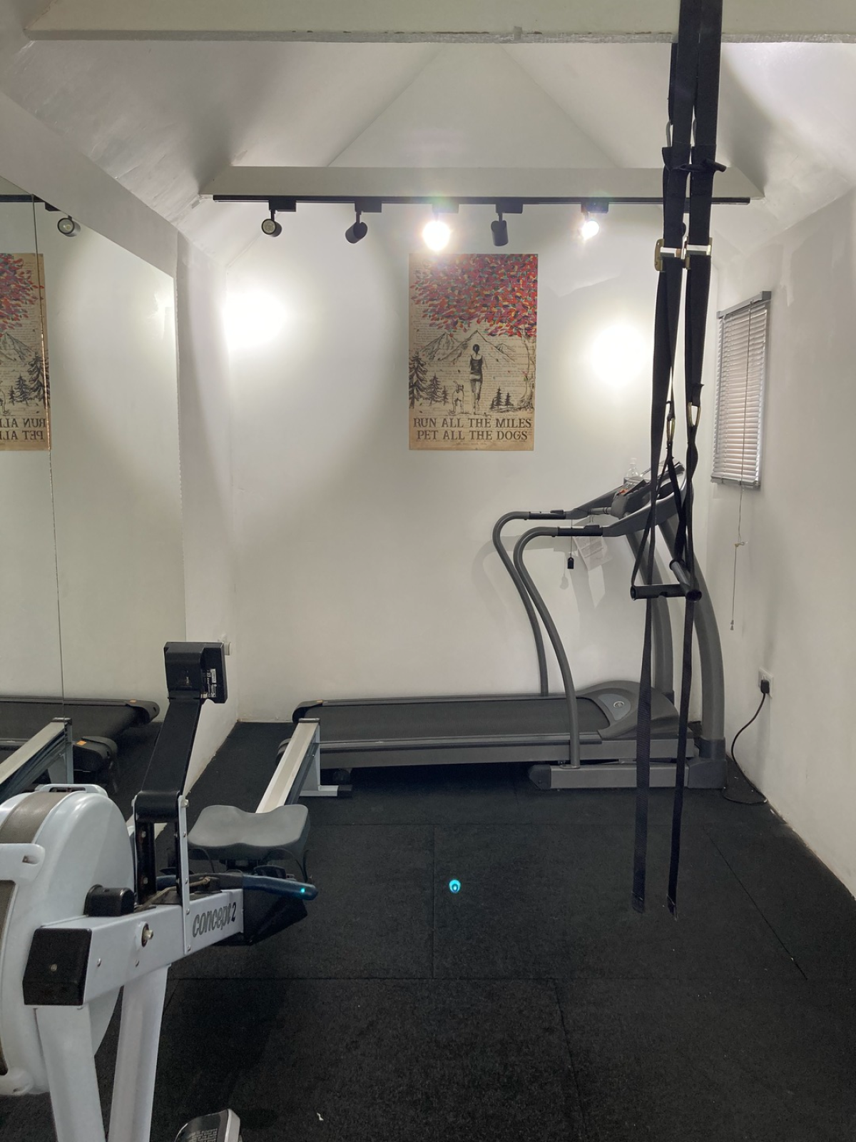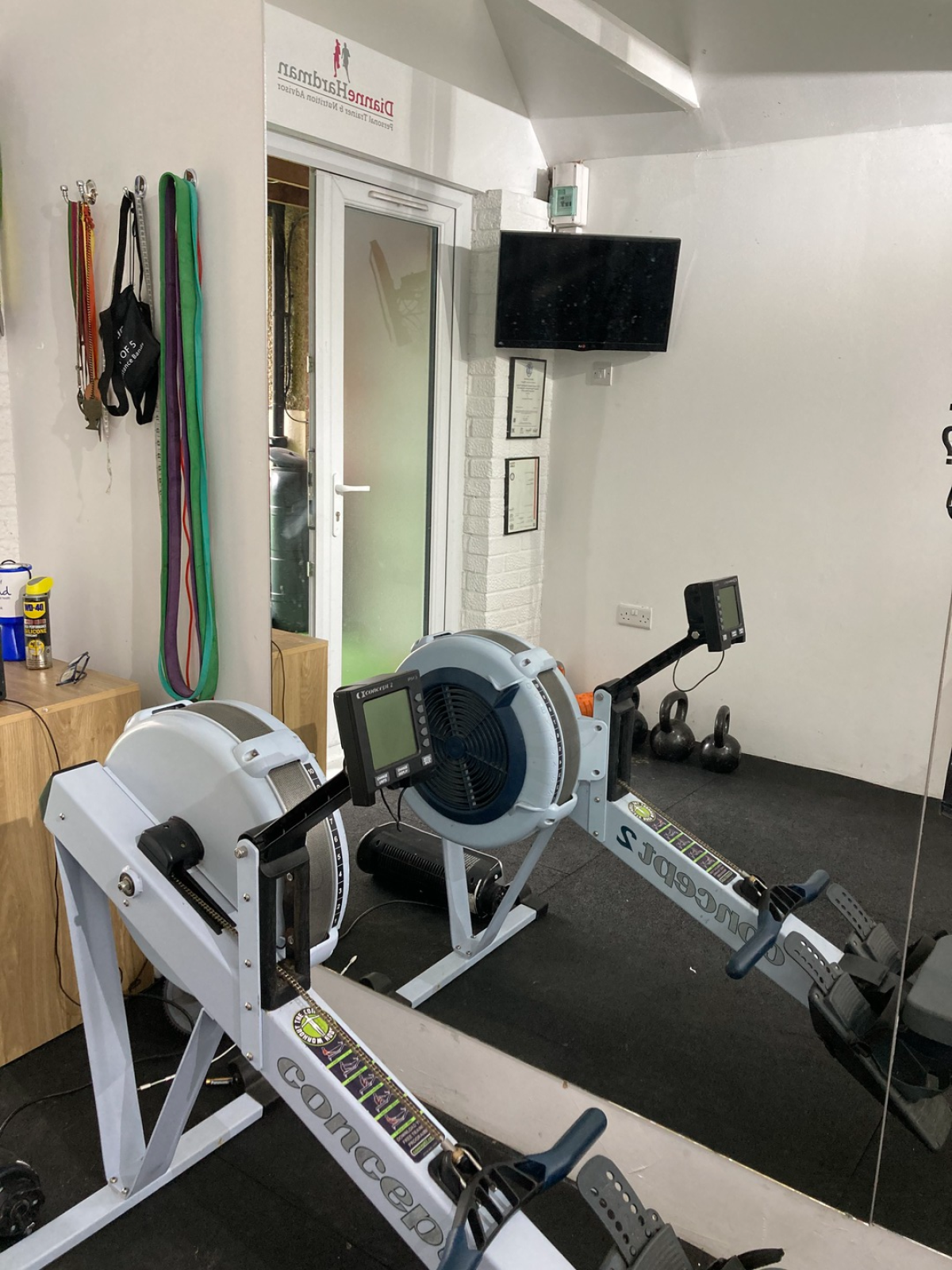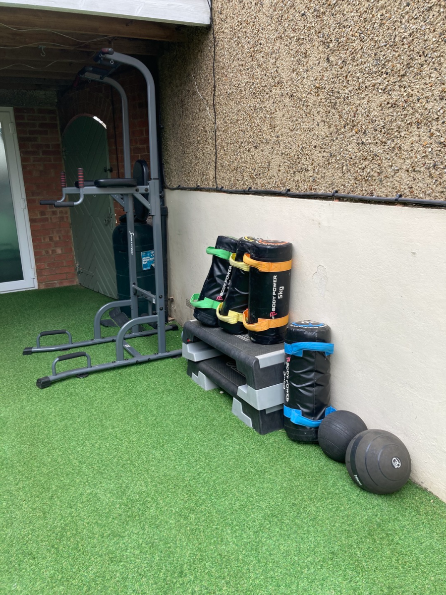 Welcome to the gym studio. There is an inside area with a treadmill, rowing machine and a TRX suspension trainer.